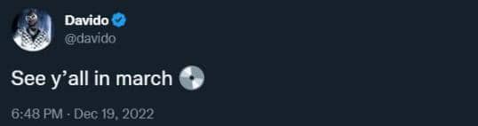 Davido who just returned to social media months after the passing of his son, Ifeanyi Adeleke, in a tweet asked his fans to anticipate his return to music in March 2023, adding a music track emoji.