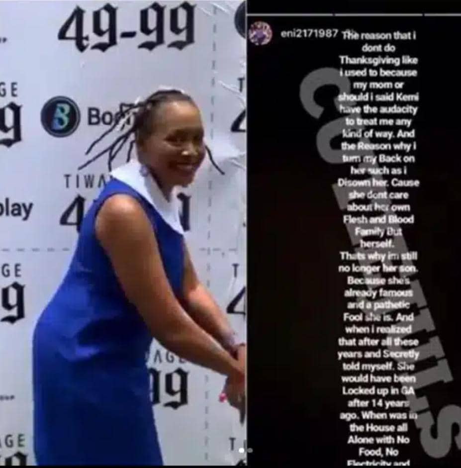 HE WROTE, “THE REASON THAT I DON’T DO THANKSGIVING LIKE I USED TO BECAUSE MY MOM OR SHOULD I SAY, KEMI HAVE THE AUDACITY TO TREAT ME ANY KIND OF WAY. AND THE REASON WHY I TURN MY BACK ON HER COS SHE DON’T CARE ABOUT HER OWN FLESH AND BLOOD FAMILY, BUT HERSELF. THAT’S WHY I AM STILL NO LONGER HER SON. BECAUSE SHE’S ALREADY FAMOUS AND A PATHETIC FOOL SHE IS AND WHEN I REALIZE THAT AFTER ALL THESE YEARS AND SECRETLY TOLD MYSELF. SHE WOULD HAVE BEEN LOCKED UP IN GA AFTER 14 YEARS AGO. I WAS IN THE HOUSE ALL ALONE. NO FOOD NO ELECTRICITY!”