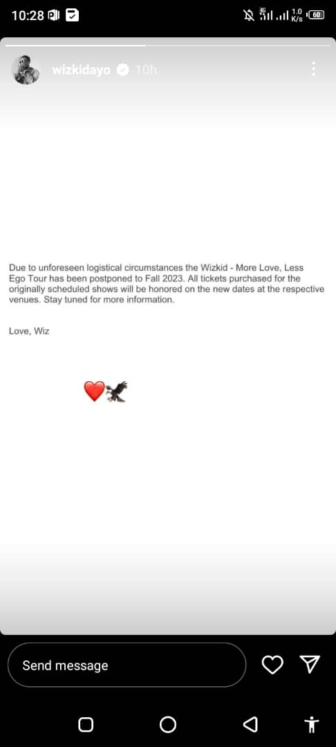 “Due to unforeseen circumstances the Wizkid – More Love, Less Ego Tour has been postponed to Fall 2023. All tickets purchased for the originally scheduled shows will be honored on the new dates at the respective venues. Stay tuned for more information”.