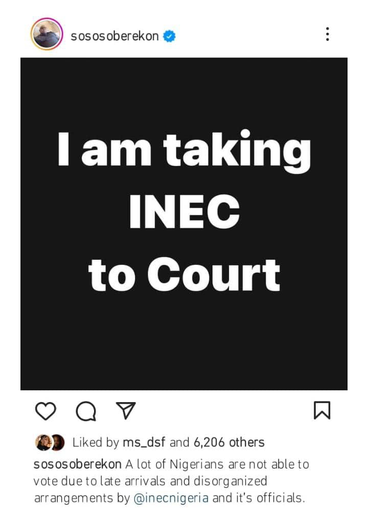 Soso Soberekon, an entertainment executive, has threatened to sue the Independent National Electoral Commission (INEC), over their incompetence.