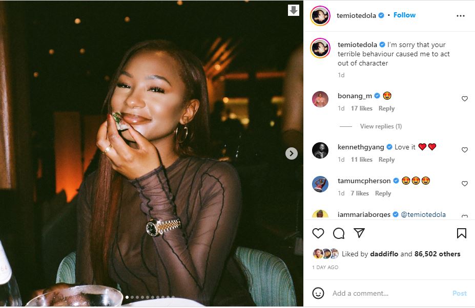 Temi wrote an apology to her admirers along with the post, expressing regret for acting out of character.