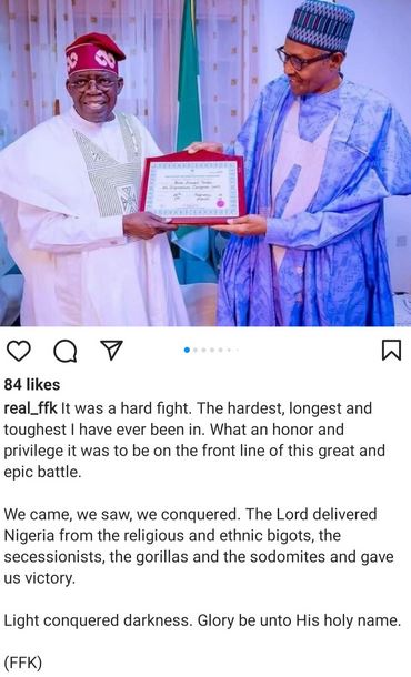 He added that eventually “light conquered darkness” and the Lord delivered Nigeria from the religious and ethnic bigots, the secessionists, the gorillas and the sodomites”.