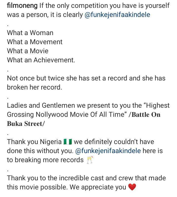 The news was shared on Instagram in a post by Film One. The post revealed that ‘Battle on Buka Street’ has broken the record of ‘Omo Ghetto The Saga’, which she released in 2020.