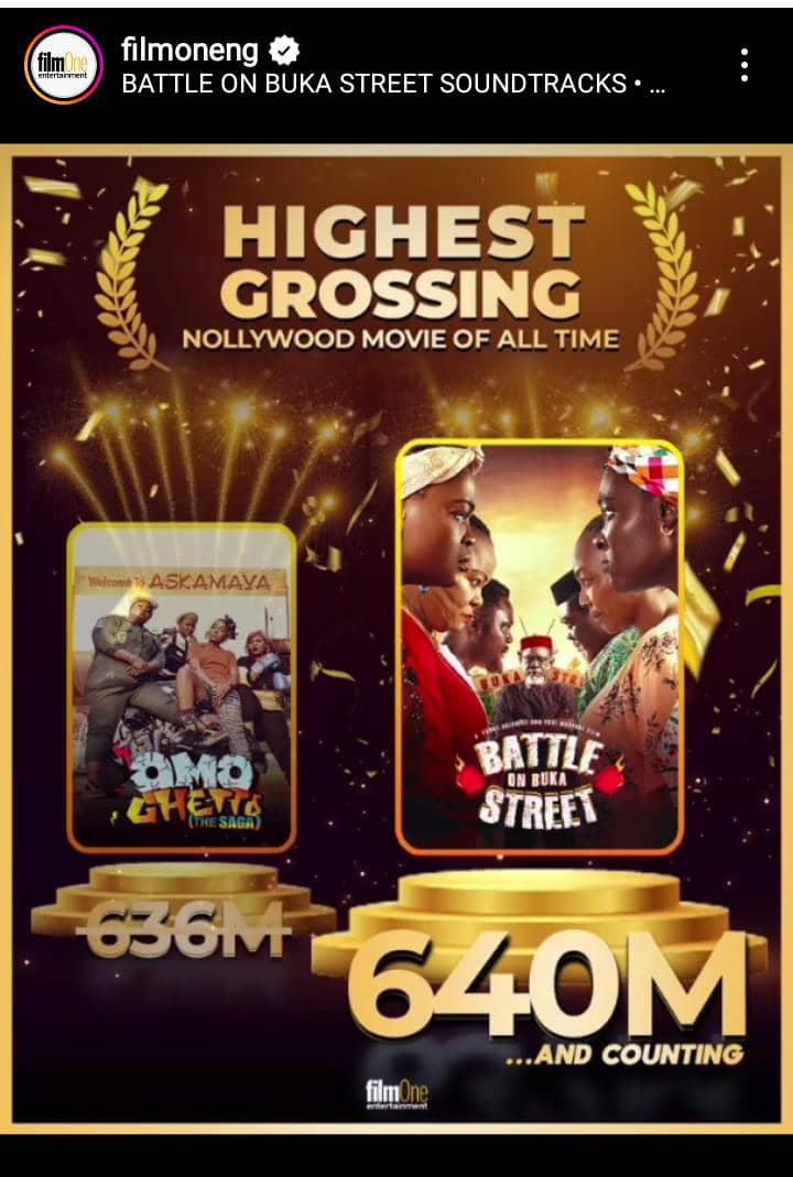 ‘Omo Ghetto The Saga’ grossed N636 million in box office while ‘Battle On Buka Street’ has grossed N640 million in box office.