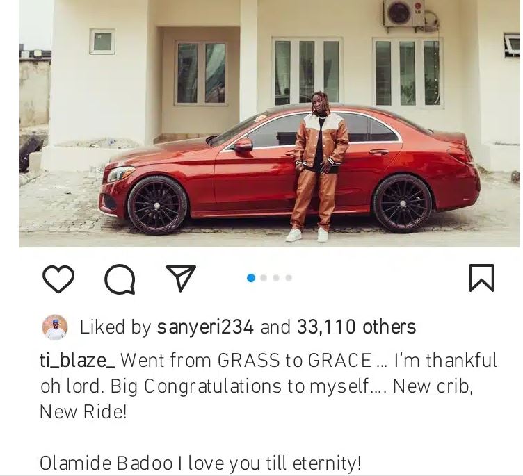 “Went from GRASS to GRACE…. I’m thankful oh Lord. Big congratulations to myself…. New crib, New Ride! Olamide Badoo! I love you till eternity.”