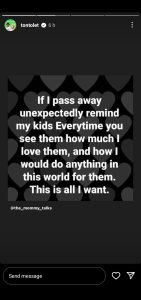 The thespian, in a post shared via her Instastory on Sunday, tasked her followers to remind her kids of her love and sacrifices for them if she “pass away unexpectedly.”