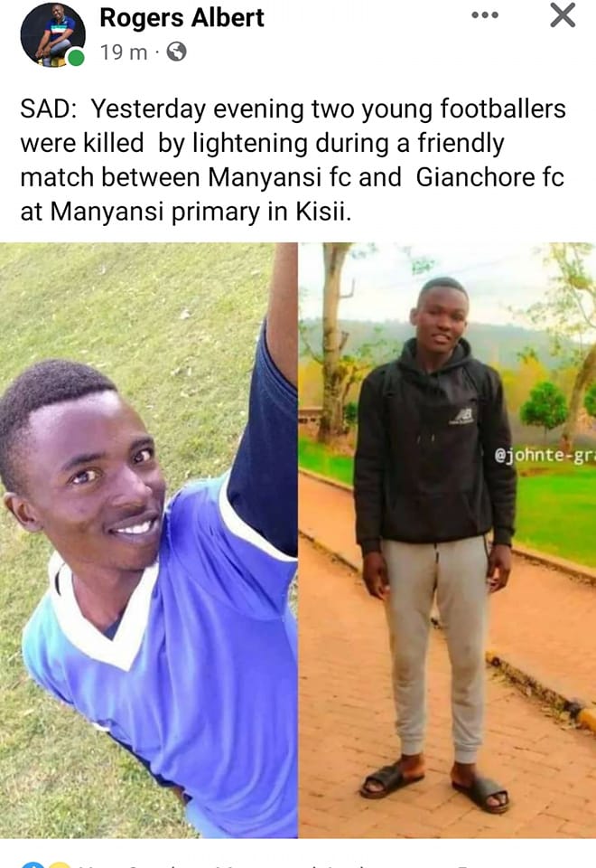 Lightning has killed two football players during a friendly match at Manyansi area, in Kitutu Chache North Constituency, Kisii County, Kenya.