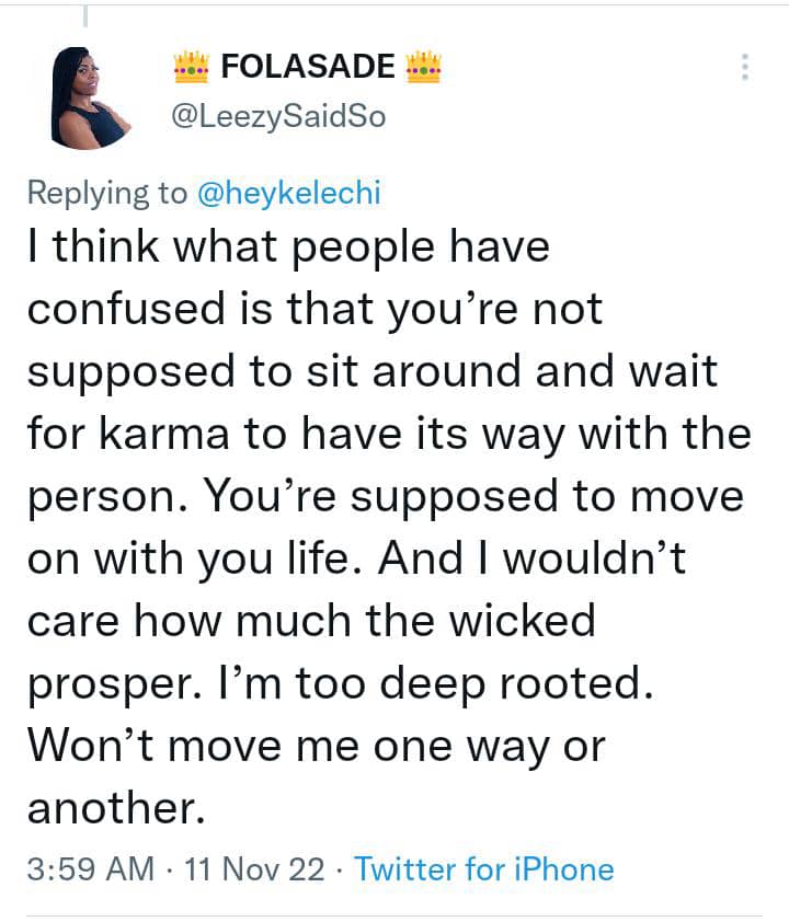“Wicked people prosper ALL THE TIME. In fact, I lowkey believe they prosper the most. Waiting for people to get their “karma” is a miserable waste of time”.