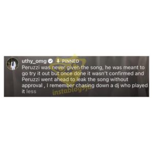 “Peruzzi was never given the song, he was meant to go try it out but once done it wasn’t confirmed and Peruzzi went ahead to leak the song without approval, I remember chasing down a Dj who played it”. He wrote.