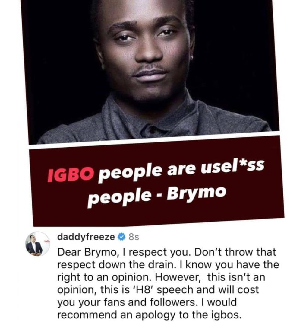 Media personality, Daddy Freeze has condemned embattled singer, Brymo for his Anti-Igbo speech.