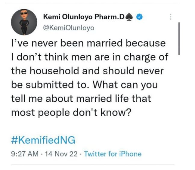 Olunloyo, on her Twitter page, stated that she doesn’t think men should be submitted to or in charge of the household.