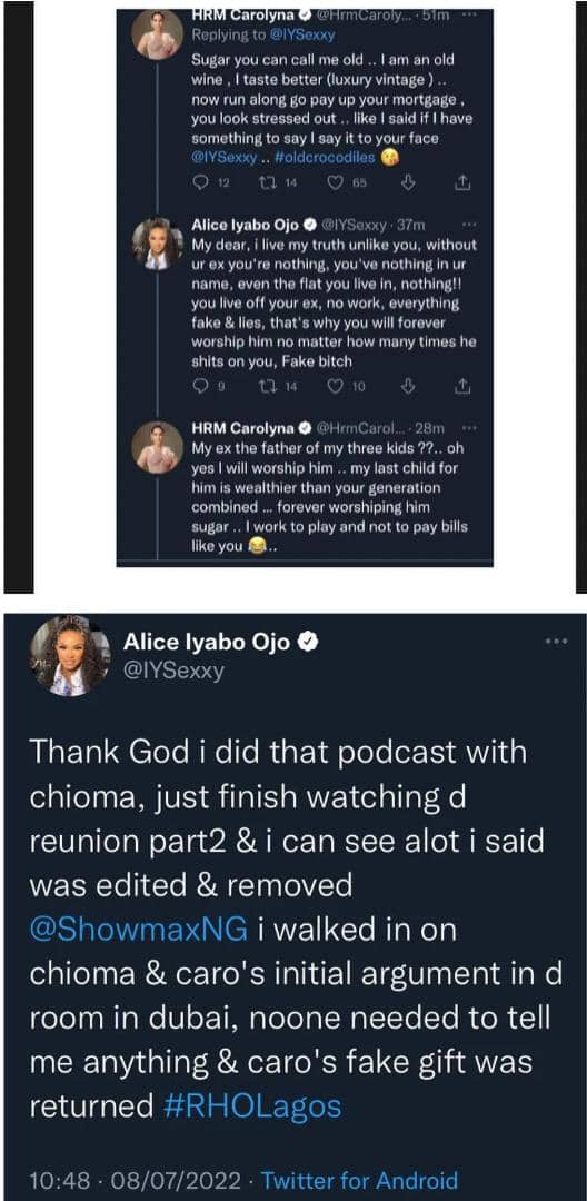 The mom of two also alleged that Carolyn is being bankrolled by her ex-husband, Musa Danjuma, which explains why she doesn’t respect women who work hard from their earnings.