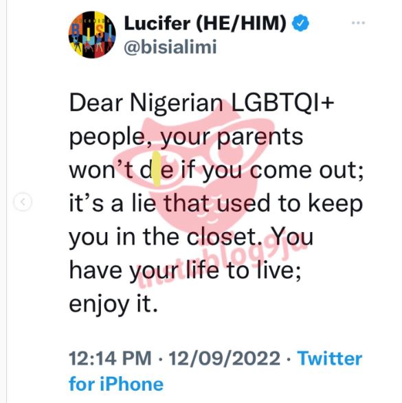 ”Dear Nigerian LGBTQI+ people, your parents won’t die if you come out; it’s a lie that used to keep you in the closet. You have your life to live; enjoy it”.